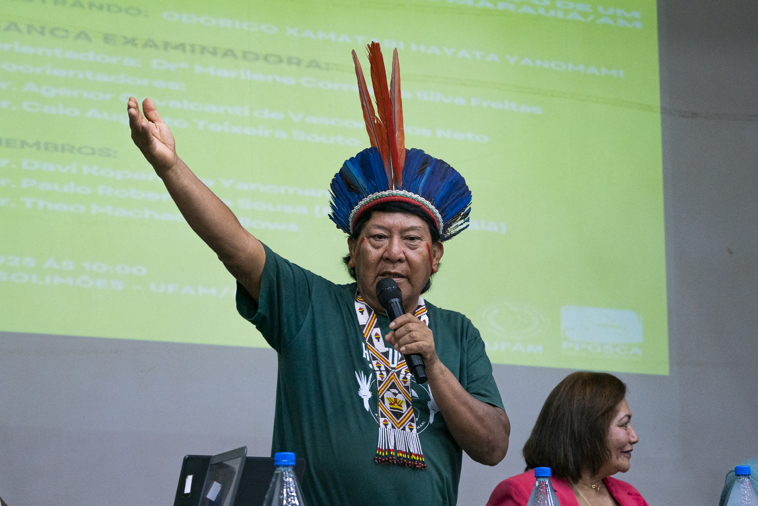 “Eu sou contra o PL da devastação. Eles querem usar nosso lugar, Surucucu, Maturacá, Pico da Neblina. Ali é a estaca da segurança da terra. Querem arrancar a riqueza para fabricar carro, avião, navio, cidade luminosa. Eles querem acabar com a gente”, criticou Davi Kopenawa.