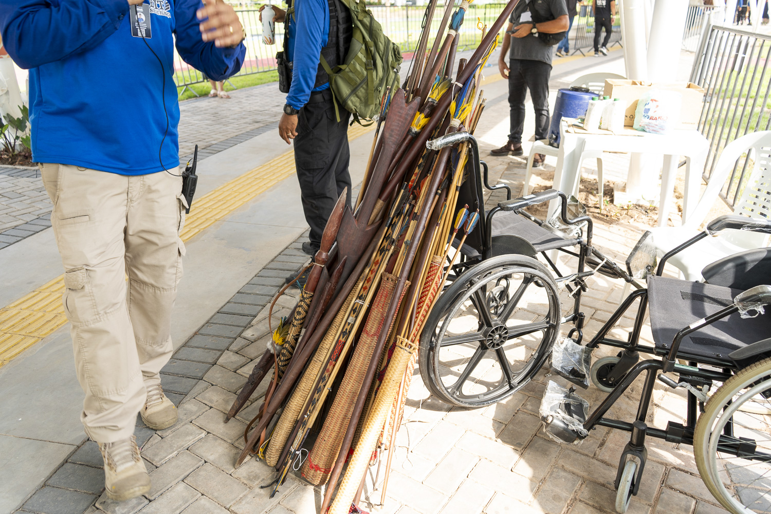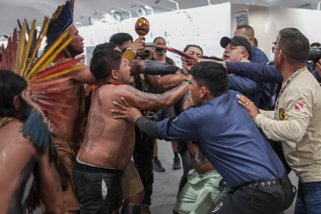 Justificando o apagamento em suas falas e nas negociações para conter a crise climática no mundo, manifestantes driblaram a GLO e a segurança da ONU para fazer o ato na Zona Azul. Lula ficou irritado. A segurança foi reforçada no local e respingou na Zona Verde: indígenas Munduruku foram barrados e tiveram flechas e bordunas retidas por seguranças e agentes da PF.
