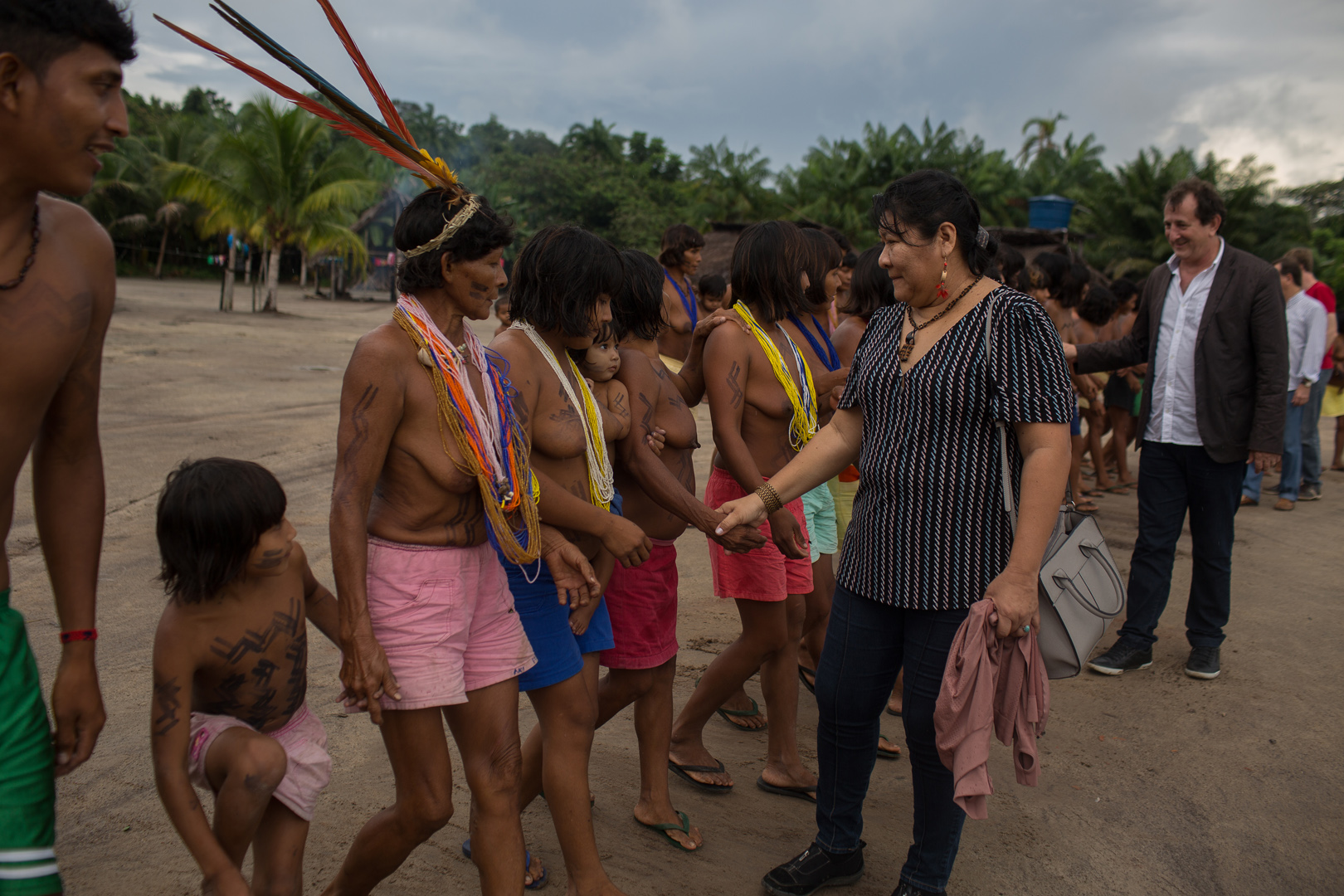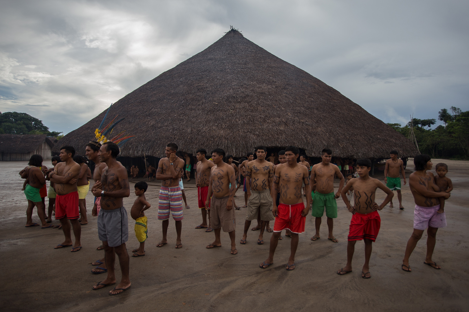 TI Waimiri Atroari/RR - 22.04.2019 - Visita da Comissao de Meio Ambiente e da Frente Parlamentar Mista em defesa dos direiros dos Povos Indigenas a Terra Indigena Waimiri Atroari: Amazonas/Roraima. Na foto indigenas sao vistos em frente a maloca da aldeia Mynawa. Foto Bruno Kelly/Amazonia Real.