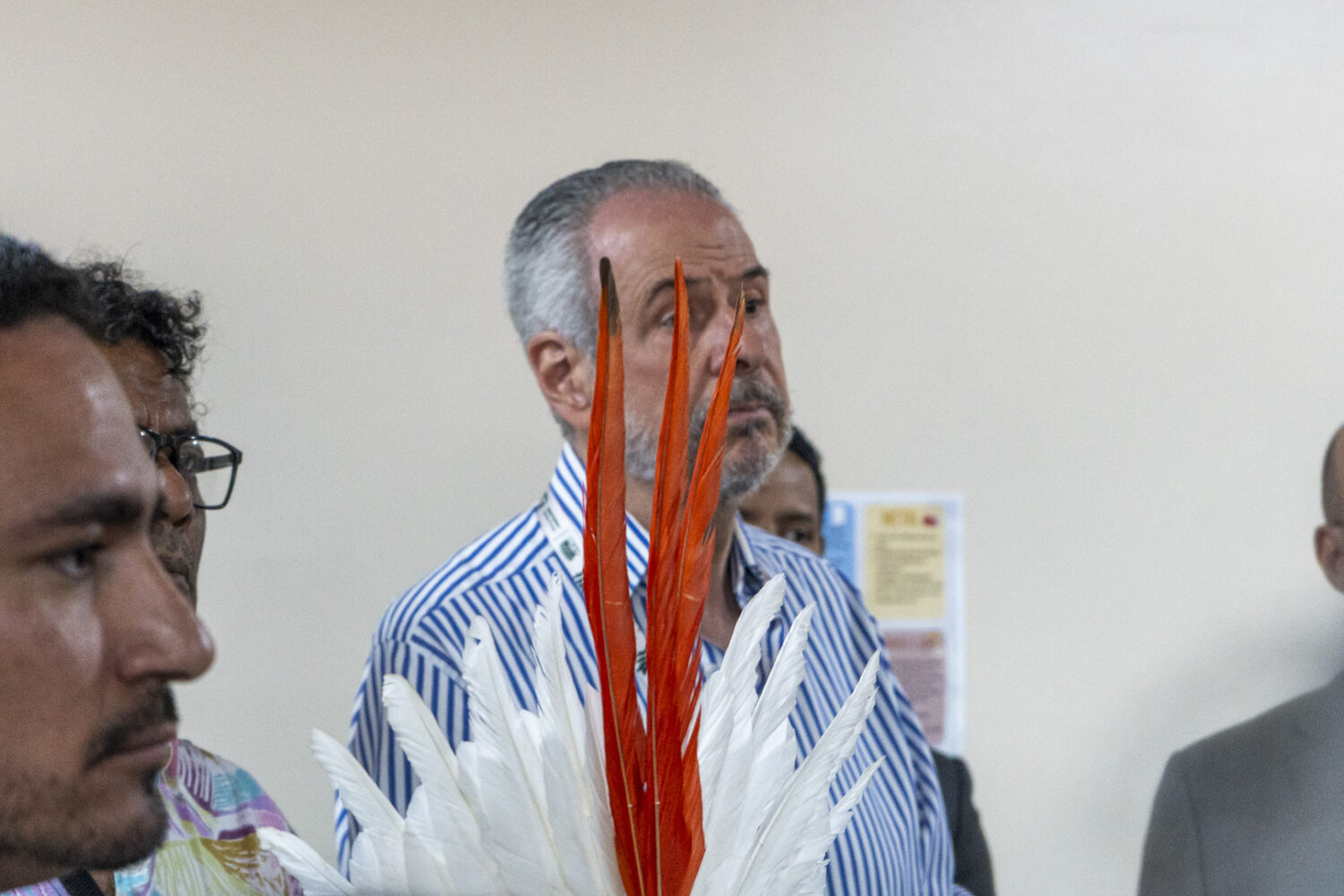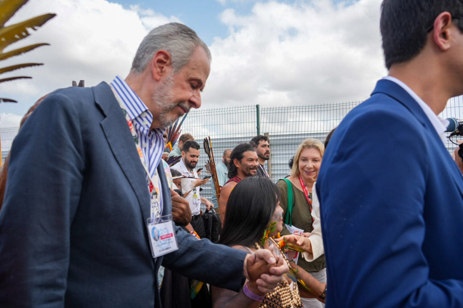 Alessandra Korap, porta voz do Movimento Munduruku Ipereğ Ayũ, ao fundo o presidente da COP30, André Correa do Lago e Ana Toni, CEO da Cop30 (Foto: Juliana Pesqueira/Amazônia Real).